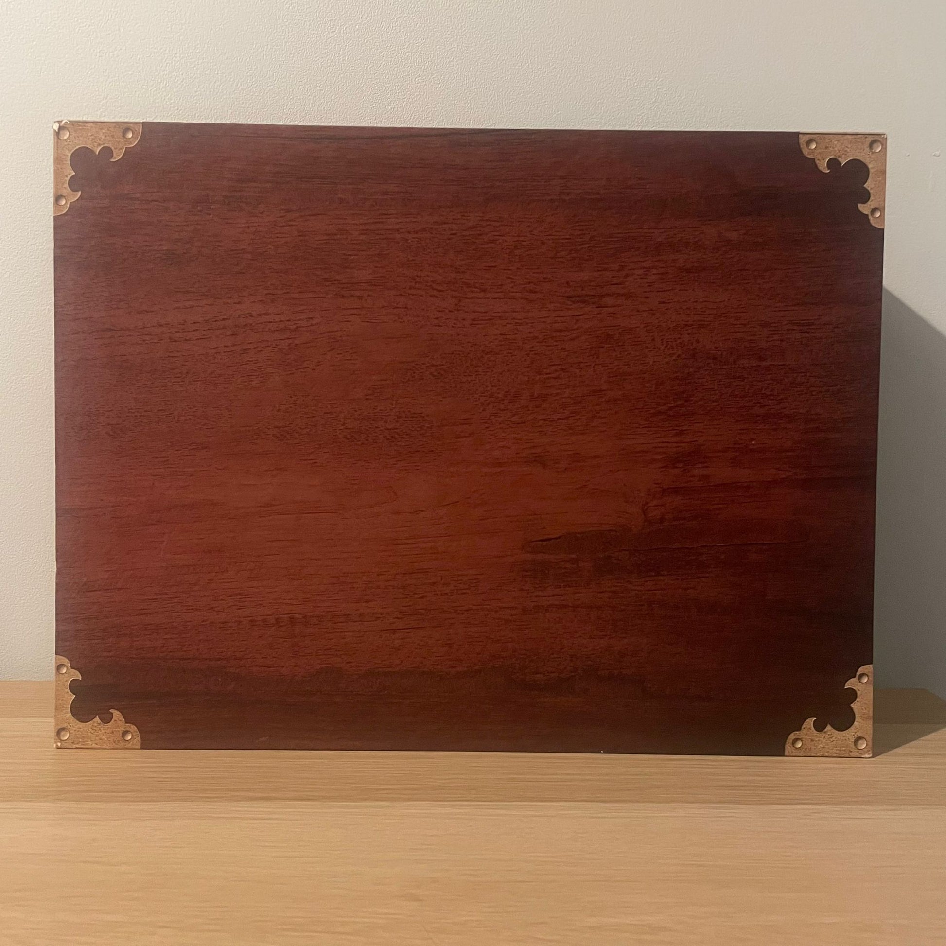 Please note that the plastic surface layer of the cardboard connecting the lid to the base has split and started peeling, the cardboard is intact so it is structurally secure. However, some tape has been placed over the plastic skin to prevent it from peeling further, please see photos.
